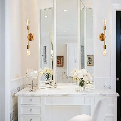 Get it as soon as wed, jun 9. Updated with a warm brass finish, elementum brings unparalleled task lighting into your bathroom, whether mounted vertically on either side of the mirror or above a vanity mirror for a flattering diffuse illumination. There is about 7 clearance between the wall and the mirror, whereas the light fixture's mounting plate width is 5, which leaves 1 between the wall (on the left) and 1 between the mirror on the right. You might have a narrow bathroom without extra space on the side, or your mirror might be so large that the sconce placement won't work. If the sconces have shades, put the bottom edges of the shades a little below eye level ( 60 to 68 inches from the floor). It comes in a range of sizes, starting at 24 x 30 inches and ranging all the way up to 48 x 36 inches, allowing you to find the ideal fit for your space. See more ideas about bathroom lighting, bathroom lights over mirror, bathroom mirror lights. See more ideas about bathroom design, beautiful bathrooms, bathrooms remodel. These modern vanity sconces are also damp and wet rated, making them safe for use next to the bathroom sink or the bathtub. Black wall sconce lighting farmhouse bathroom vanity light fixtures over mirror, modern wall sconces lighting bedroom wall sconce light hallway light with clear glass shades 4.8 out of 5 stars 6 $46.99 $ 46. How bathroom sconces can add to your bathroom's design finding the right balance between ambient, task and accent lighting is difficult without the use of bathroom wall sconces.while ambient lighting can be easily provided by a bathroom ceiling light, creating task lighting solely with vanity light can sometimes leave your lighting unequal. It has a beautiful day light glow surrounding to give you the perfect light for your reflection. In bathrooms, mount sconces 36 to 40 inches apart, flanking the mirror, 18 inches from the sink's center line.